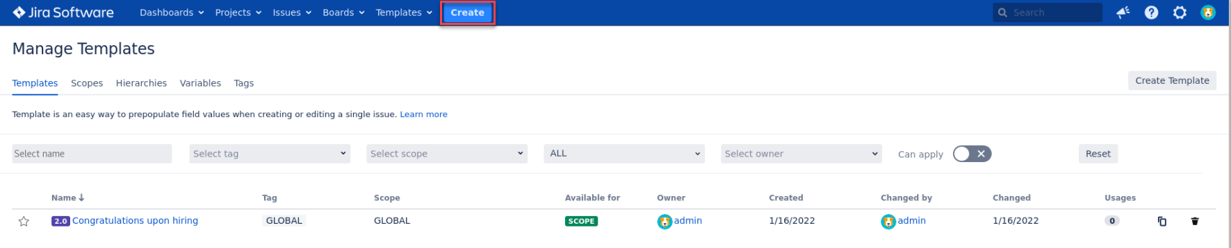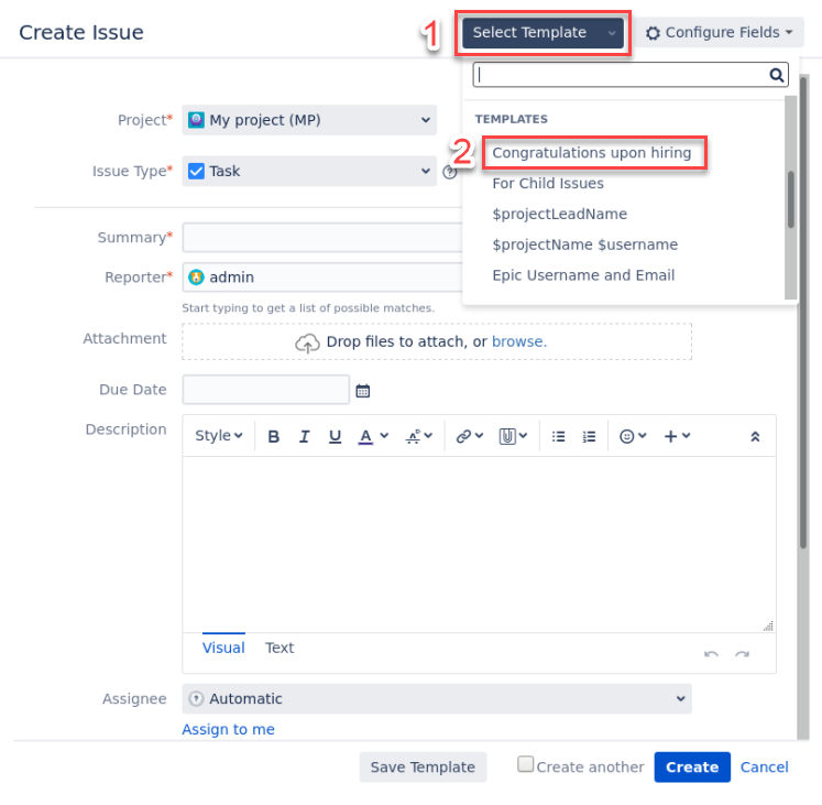 The ‘Create Issue’ dialog will open. Use the ‘Select Template’ button to select the ‘Congratulations upon hiring’ template.