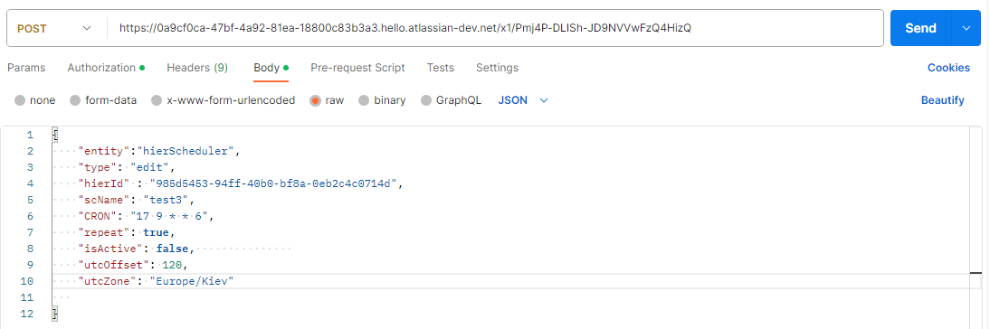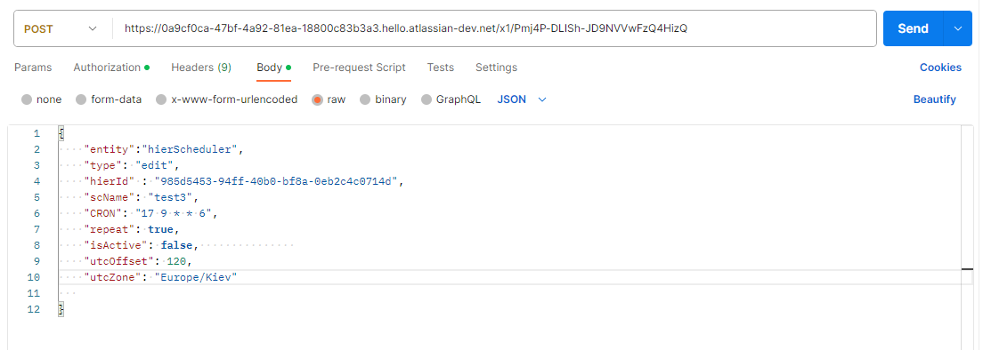 curl --location 'https://0a9cf0ca-47bf-4a92-81ea-18800c83b3a3.hello.atlassian-dev.net/x1/Pmj4P-DLISh-JD9NVVwFzQ4HizQ' \--header 'Content-Type: application/json' \--header 'Authorization: Bearer eyJhbGciOiJIUzI1NiIsInR5cCI6IkpXVCJ9.eyJleHBpcmVzSW4iOiI3IGRheXMiLCJzY29wZSI6WyJhbGwiXSwiYWNjb3VudElkIjoiNjBmNTE5ZDMyYjU2Y2MwMDY5NTU1OWJlIiwiaGFzaCI6IjVlYWEyZDE4NTAxNzhjMzM3MzNkZTc5YjIzYzBlZWZkMDQ0MzIyZjA1NGY1MzRiNjdhZWFhZTMzZWZmOTljYmFhY2MzNmIyYzdhZGUzMTk3YjkxZGI4YmE5ZTk2YjNhZDNjMDVkZGEyZjNiMGE1OWU1YjYxNjg1ODBjMjdmOTI1ODAwYTE0YjAyMWZkN2NmYzQxMDE2YzhjOTk3NDI0ZTEyMzA3ZDYyNmFjZmUwYWJiYzgzN2RhYTc2Y2QzZWJiNGVjOWZhZjExZjllZGU5M2VjZDUyNDkzMThmYmZkMDJlODJkYjE4ZmU2YjhmYjg4MzgzMGMwMzIyZWE5MTY0OTMiLCJpYXQiOjE3MDAxOTY1OTgsImV4cCI6MTcwMDgwMTM5OH0.P9rfoLhJ0QTyJRUnZPceplnGI_jAUFVmekydKOVX6l8' \--data '{ "entity":"hierScheduler", "type": "edit", "hierId" : "985d5453-94ff-40b0-bf8a-0eb2c4c0714d", "scName": "test3", "CRON": "17 9 * * 6", "repeat": true, "isActive": false, "utcOffset": 120, "utcZone": "Europe/Kiev"