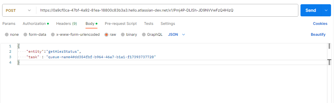 curl --location 'https://0a9cf0ca-47bf-4a92-81ea-18800c83b3a3.hello.atlassian-dev.net/x1/Pmj4P-DLISh-JD9NVVwFzQ4HizQ' \--header 'Content-Type: application/json' \--header 'Authorization: Bearer eyJhbGciOiJIUzI1NiIsInR5cCI6IkpXVCJ9.eyJleHBpcmVzSW4iOiI3IGRheXMiLCJzY29wZSI6WyJhbGwiXSwiYWNjb3VudElkIjoiNjBmNTE5ZDMyYjU2Y2MwMDY5NTU1OWJlIiwiaGFzaCI6IjVlYWEyZDE4NTAxNzhjMzM3MzNkZTc5YjIzYzBlZWZkMDQ0MzIyZjA1NGY1MzRiNjdhZWFhZTMzZWZmOTljYmFhY2MzNmIyYzdhZGUzMTk3YjkxZGI4YmE5ZTk2YjNhZDNjMDVkZGEyZjNiMGE1OWU1YjYxNjg1ODBjMjdmOTI1ODAwYTE0YjAyMWZkN2NmYzQxMDE2YzhjOTk3NDI0ZTEyMzA3ZDYyNmFjZmUwYWJiYzgzN2RhYTc2Y2QzZWJiNGVjOWZhZjExZjllZGU5M2VjZDUyNDkzMThmYmZkMDJlODJkYjE4ZmU2YjhmYjg4MzgzMGMwMzIyZWE5MTY0OTMiLCJpYXQiOjE3MDAxOTY1OTgsImV4cCI6MTcwMDgwMTM5OH0.P9rfoLhJ0QTyJRUnZPceplnGI_jAUFVmekydKOVX6l8' \--data '{ "entity":"getHierStatus", "task" : "queue-name4#dd354fbf-b964-46a7-b1a1-f17393737720"}'