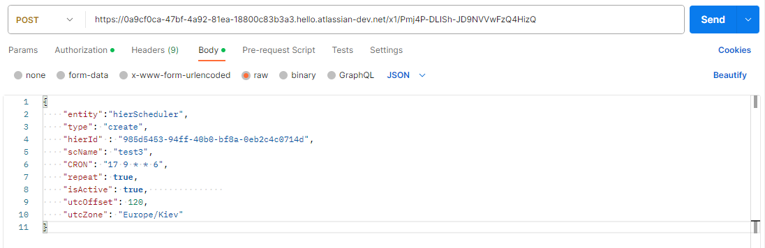 curl --location 'https://0a9cf0ca-47bf-4a92-81ea-18800c83b3a3.hello.atlassian-dev.net/x1/Pmj4P-DLISh-JD9NVVwFzQ4HizQ' \--header 'Content-Type: application/json' \--header 'Authorization: Bearer eyJhbGciOiJIUzI1NiIsInR5cCI6IkpXVCJ9.eyJleHBpcmVzSW4iOiI3IGRheXMiLCJzY29wZSI6WyJhbGwiXSwiYWNjb3VudElkIjoiNjBmNTE5ZDMyYjU2Y2MwMDY5NTU1OWJlIiwiaGFzaCI6IjVlYWEyZDE4NTAxNzhjMzM3MzNkZTc5YjIzYzBlZWZkMDQ0MzIyZjA1NGY1MzRiNjdhZWFhZTMzZWZmOTljYmFhY2MzNmIyYzdhZGUzMTk3YjkxZGI4YmE5ZTk2YjNhZDNjMDVkZGEyZjNiMGE1OWU1YjYxNjg1ODBjMjdmOTI1ODAwYTE0YjAyMWZkN2NmYzQxMDE2YzhjOTk3NDI0ZTEyMzA3ZDYyNmFjZmUwYWJiYzgzN2RhYTc2Y2QzZWJiNGVjOWZhZjExZjllZGU5M2VjZDUyNDkzMThmYmZkMDJlODJkYjE4ZmU2YjhmYjg4MzgzMGMwMzIyZWE5MTY0OTMiLCJpYXQiOjE3MDAxOTY1OTgsImV4cCI6MTcwMDgwMTM5OH0.P9rfoLhJ0QTyJRUnZPceplnGI_jAUFVmekydKOVX6l8' \--data '{ "entity":"hierScheduler", "type": "create", "hierId" : "985d5453-94ff-40b0-bf8a-0eb2c4c0714d", "scName": "test3", "CRON": "17 9 * * 6", "repeat": true, "isActive": true, "utcOffset": 120, "utcZone": "Europe/Kiev"}'