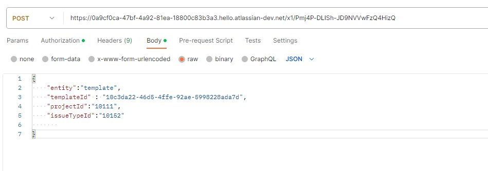curl --location 'https://0a9cf0ca-47bf-4a92-81ea-18800c83b3a3.hello.atlassian-dev.net/x1/Pmj4P-DLISh-JD9NVVwFzQ4HizQ' \--header 'Content-Type: application/json' \--header 'Authorization: Bearer eyJhbGciOiJIUzI1NiIsInR5cCI6IkpXVCJ9.eyJleHBpcmVzSW4iOiI3IGRheXMiLCJzY29wZSI6WyJhbGwiXSwiYWNjb3VudElkIjoiNjBmNTE5ZDMyYjU2Y2MwMDY5NTU1OWJlIiwiaGFzaCI6IjVlYWEyZDE4NTAxNzhjMzM3MzNkZTc5YjIzYzBlZWZkMDQ0MzIyZjA1NGY1MzRiNjdhZWFhZTMzZWZmOTljYmFhY2MzNmIyYzdhZGUzMTk3YjkxZGI4YmE5ZTk2YjNhZDNjMDVkZGEyZjNiMGE1OWU1YjYxNjg1ODBjMjdmOTI1ODAwYTE0YjAyMWZkN2NmYzQxMDE2YzhjOTk3NDI0ZTEyMzA3ZDYyNmFjZmUwYWJiYzgzN2RhYTc2Y2QzZWJiNGVjOWZhZjExZjllZGU5M2VjZDUyNDkzMThmYmZkMDJlODJkYjE4ZmU2YjhmYjg4MzgzMGMwMzIyZWE5MTY0OTMiLCJpYXQiOjE3MDAxOTY1OTgsImV4cCI6MTcwMDgwMTM5OH0.P9rfoLhJ0QTyJRUnZPceplnGI_jAUFVmekydKOVX6l8' \--data '{ "entity":"template", "templateId" : "10c3da22-46d5-4ffe-92ae-5998228ada7d", "projectId":"10111", "issueTypeId":"10152"