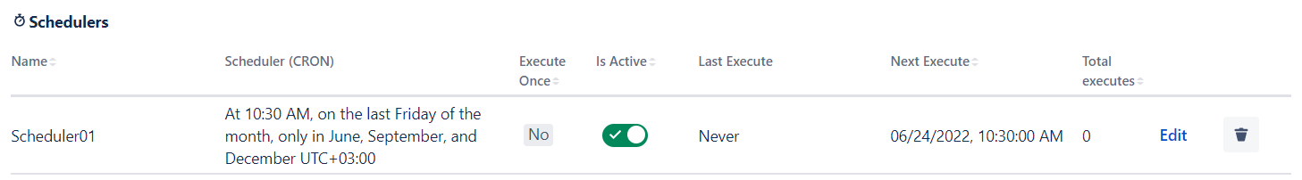 Delete - click to delete permanently scheduler settings (can be not shown if the ‘Delete Scheduler’ permission is not granted)