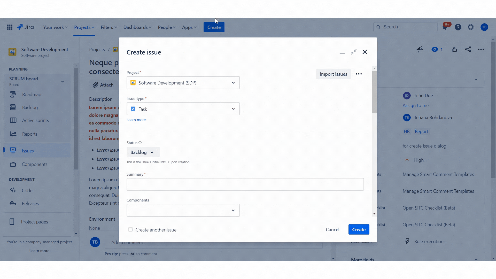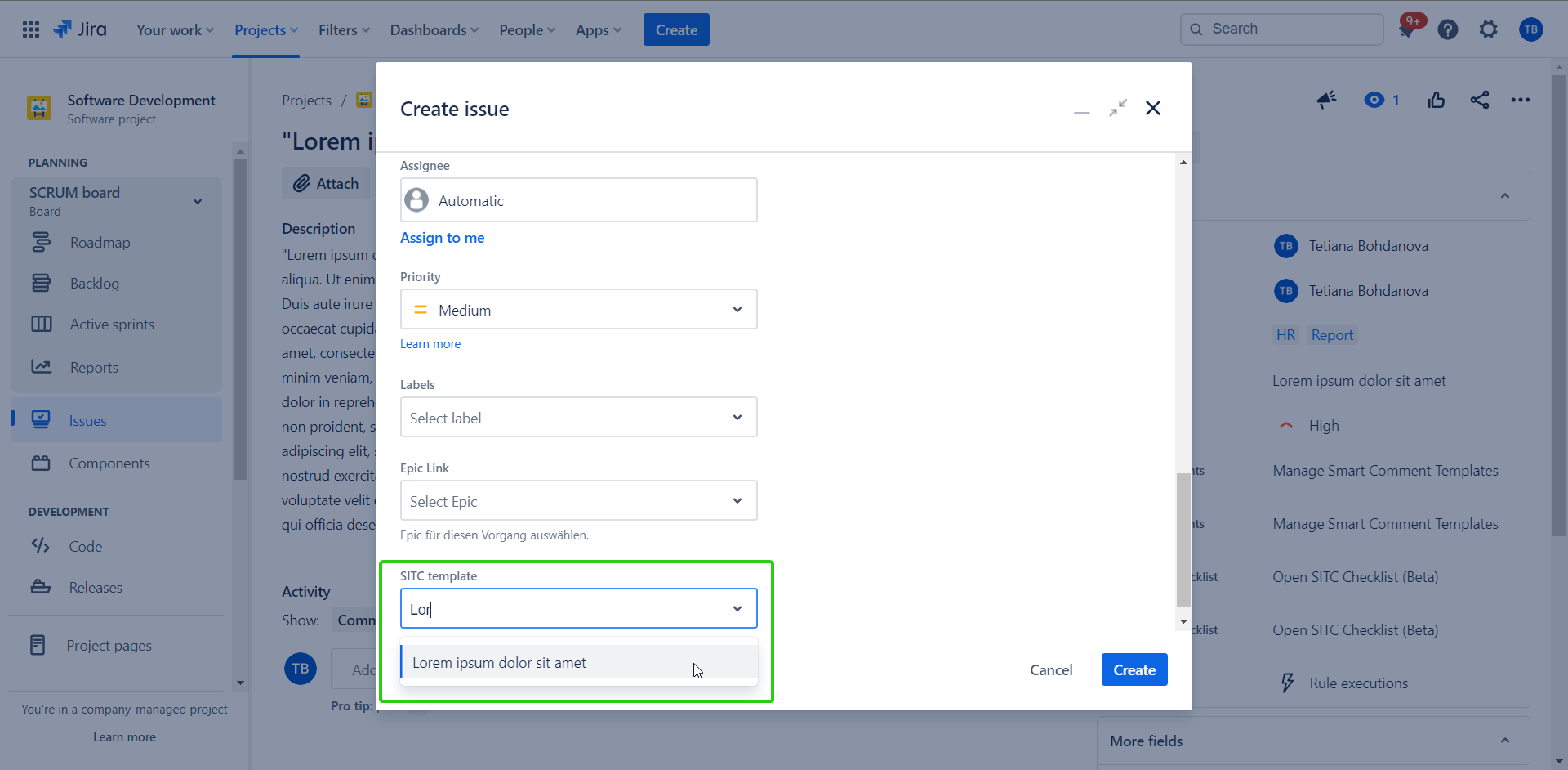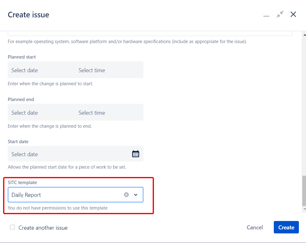 Now the ‘SITC Template’ custom field will be shown in the ‘Create Issue Jira’ dialog