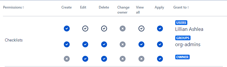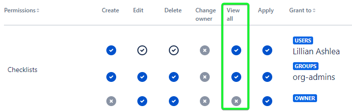 In this sample, org-admins have all Permissions but the Lillian Ashlea user can edit, delete, and view only his Checklists.