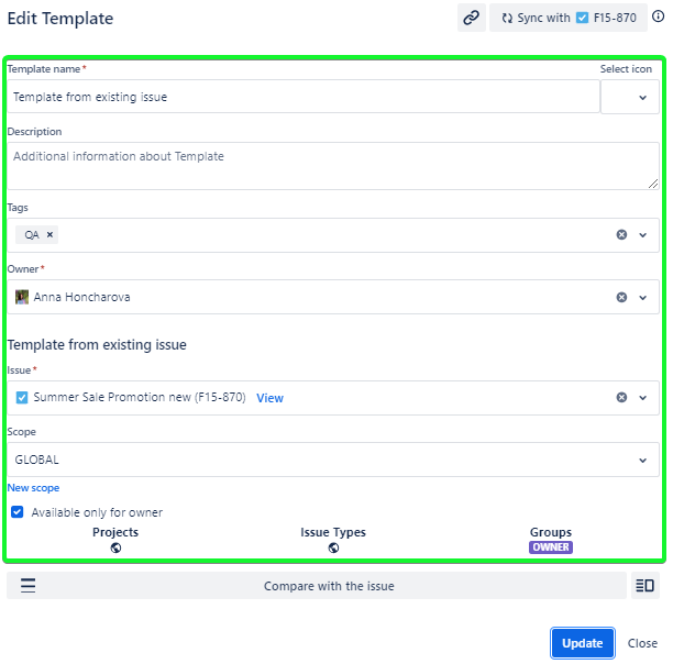 If you want to change the values that the Template will fill in the fields you need to change the original Jira issue first and then update the state of the Template via the “Sync with” button. Then you can check the difference between the current state of the Template and the issue it originated from by clicking on the “Compare with the issue” button.