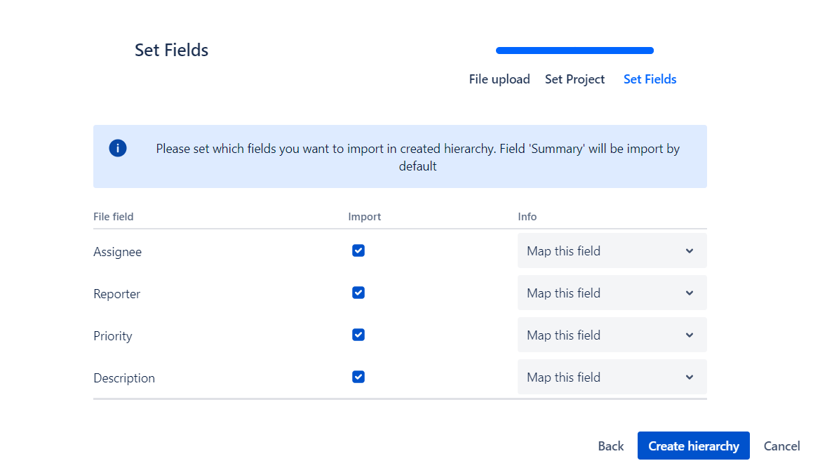 You can import data from the Summary, Description, Assignee, Reporter, and Priority fields. To skip one of these fields select the ‘Do not map this item’ option in the next dialog and click the Create Hierarchy button.