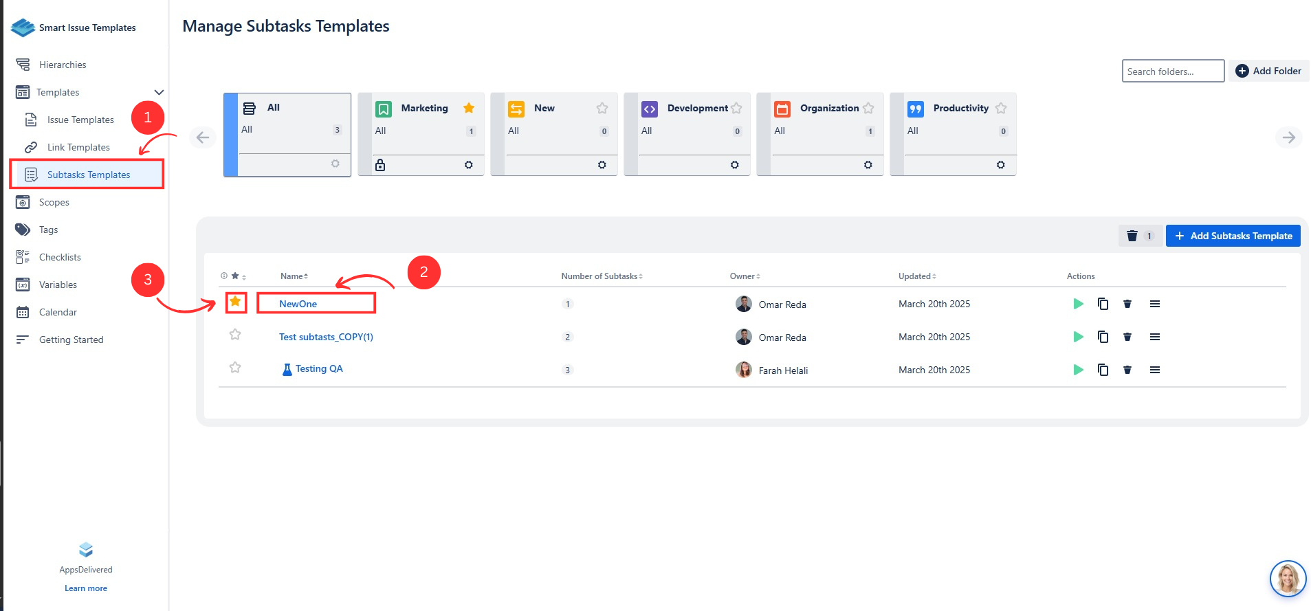 Locate the Subtasks Template that is currently marked as Favorite (indicated by a filled Star icon ⭐).