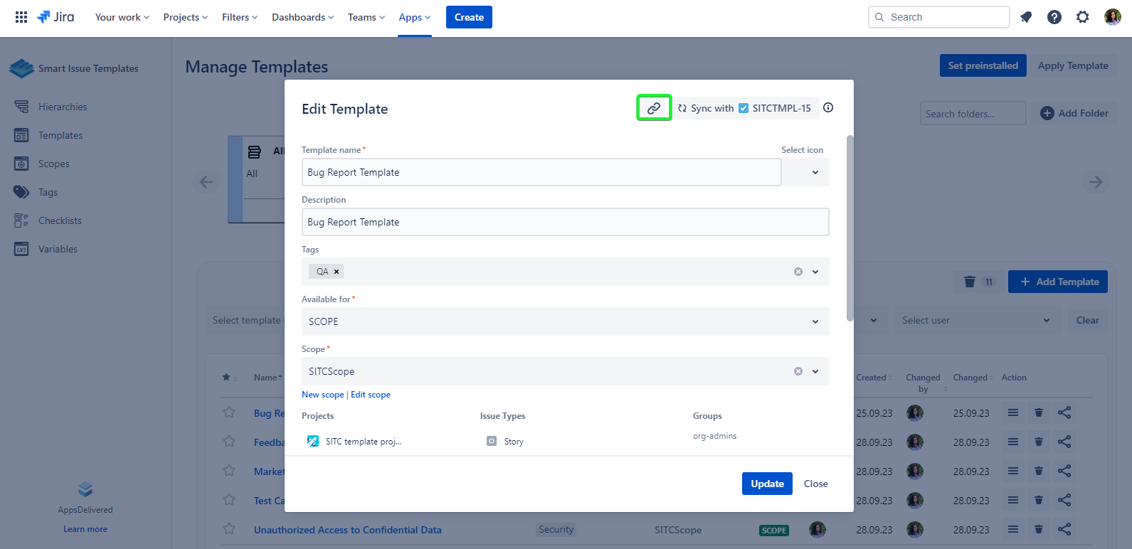 5 | Scope | Restricts Template’s visibility. The Template will be available only in projects and issue types specified in the Scope. |