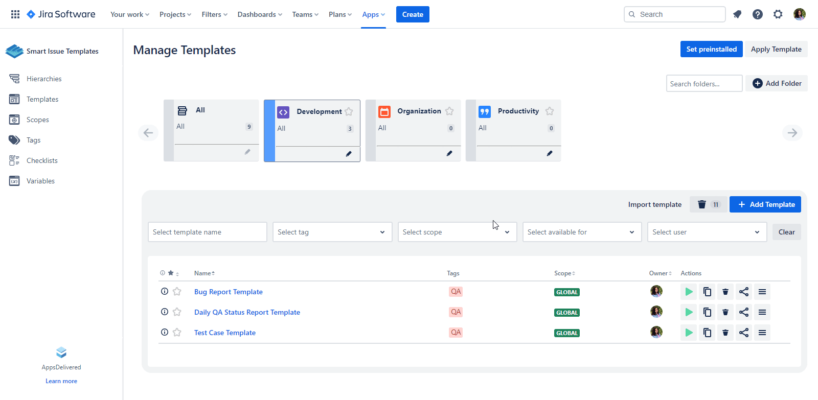 The ‘Manage Templates' page is the central location where all your created templates are housed. You can execute various actions on these templates depending on your granted permissions, you can execute various actions on these templates. To access this page, navigate to the 'Apps' section, then select 'Manage Templates.' Within this area, click the 'Templates’ button in the left navigation panel.