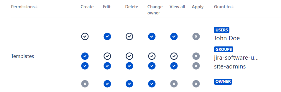 Members of the jira-software-users group (except John Doe) can create templates, but ‘Edit’, ‘Delete’, and ‘Change’ owner actions are available only for templates every user of this group is the owner of. The ‘View All’ permission is disabled so every user of the software-users group will be able to see only see his own Templates and Templates that are available for the group he belongs to.