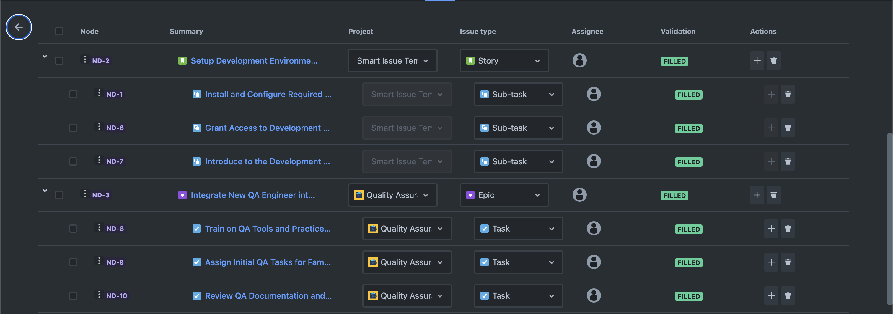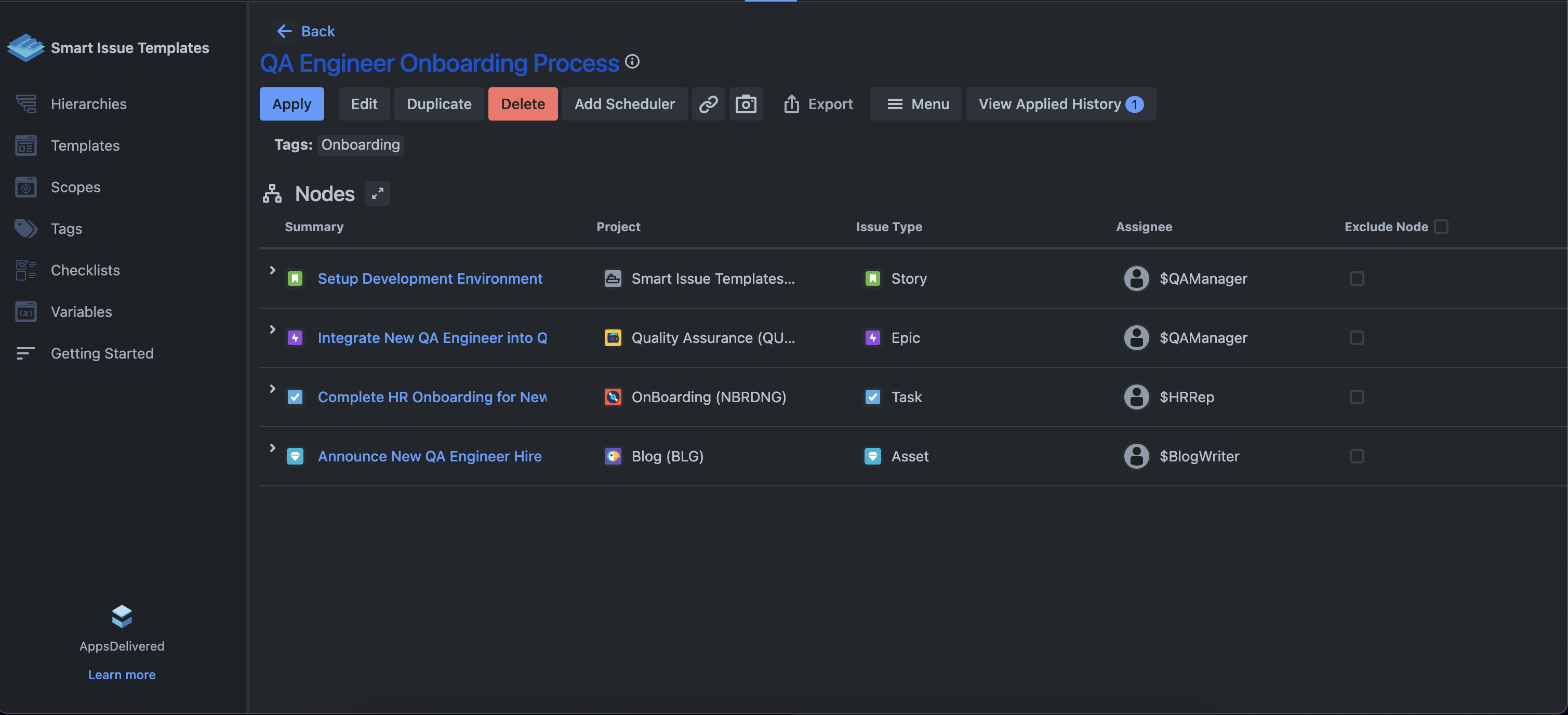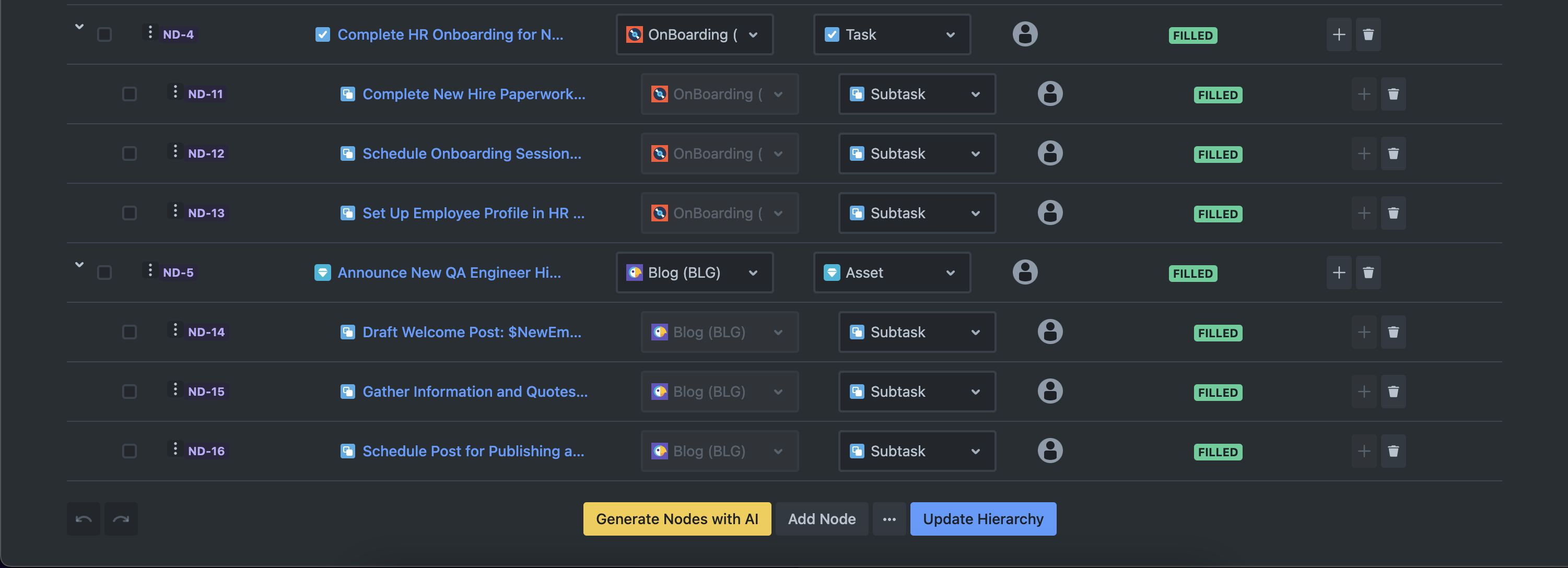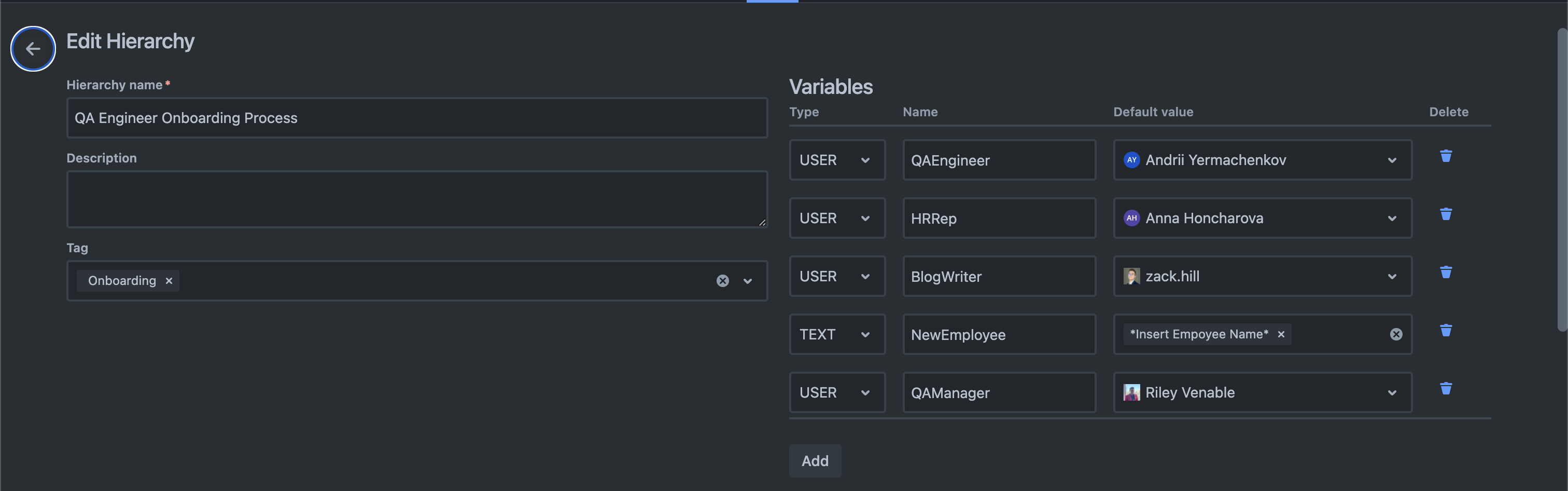 The onboarding workflow is segmented into specific tasks and sub-tasks, categorized under distinct aspects of the onboarding process. Each task is assigned to the appropriate individual or team, employing variable fields like “$NewEmployee” for dynamically inputting the new hire's name and “$Assignee” for automatically assigning tasks to specified individuals. The workflow spans several categories, including setting up the development environment, integrating the new QA Engineer into QA processes, completing HR onboarding requirements, and announcing the new hire on the company blog.