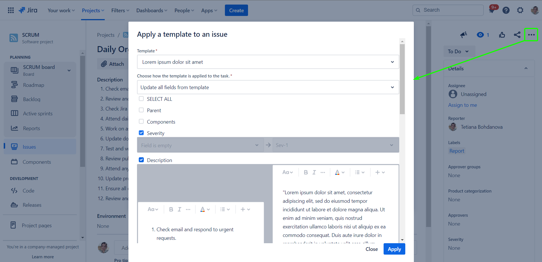 We added the ability to apply SITC Templates to existing Jira issues, providing the flexibility to select which fields to overwrite while leaving the remaining fields unchanged. Users can access this feature through a native dialog on the Jira Issue view page, making the process streamlined and straightforward.