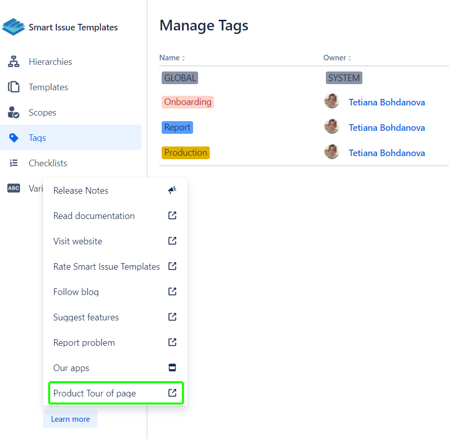 To launch a Product tour, open the needed page and click the Learn More → Product tour of the page on the side navigation panel: