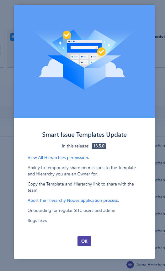 Added the notification for the app update, so you are aware of the new major version, including information on the new features and improvements. This will help teams that use Smart Issue Templates stay up-to-date with the latest version and take advantage of the app’s new capabilities.