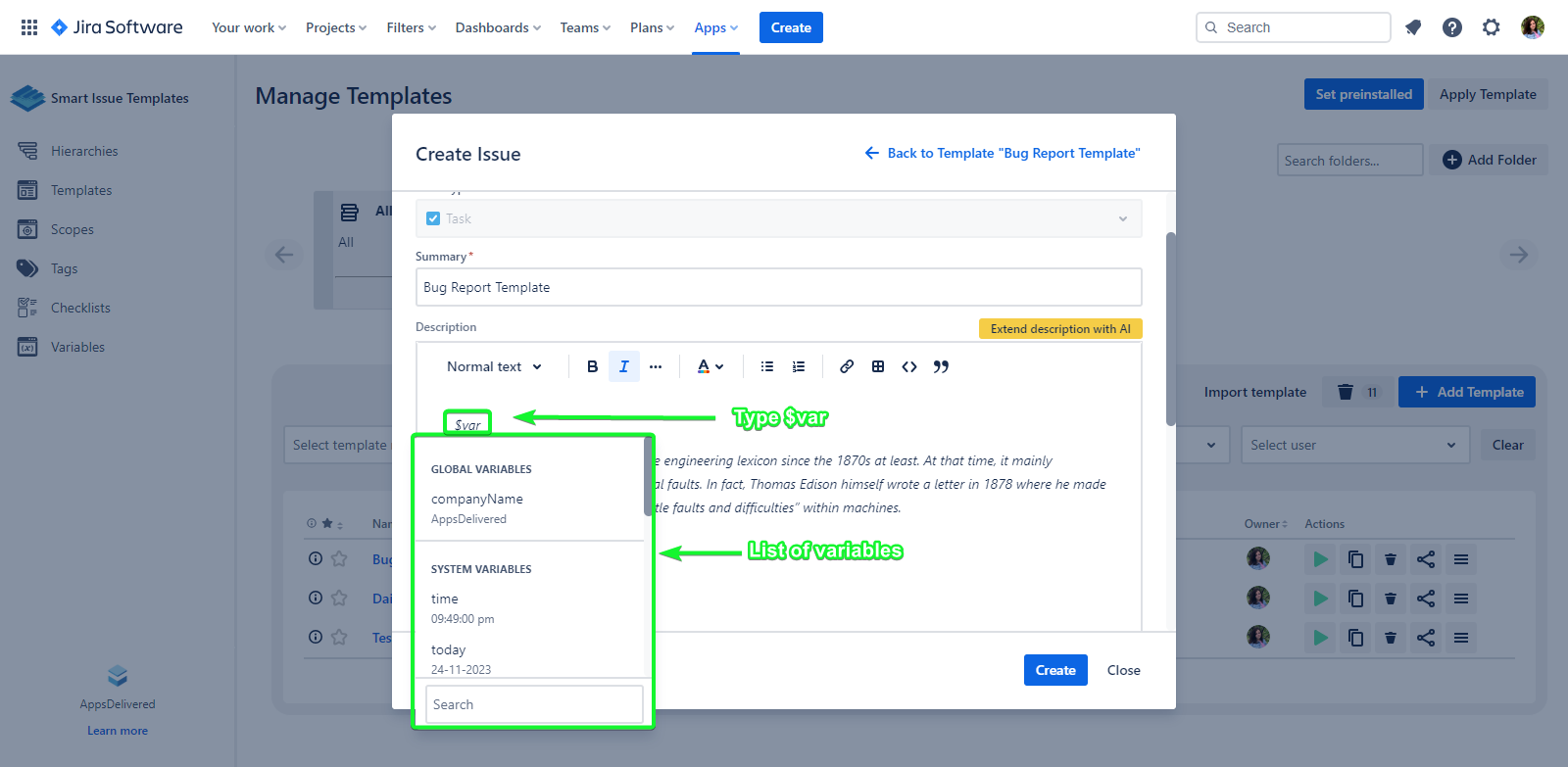 $varin a text field, and a dropdown list of all available variables will appear. This feature eliminates the need to memorize variable names, streamlining your workflow.Seamless Variable Insertion: Select any variable from the dropdown list, and it will be automatically inserted into your text field. When you apply the template, these variable names will be replaced with their corresponding text values, ensuring accuracy and saving time.
