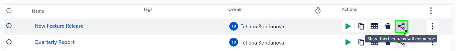 1. Open the Manage Hierarchies page and click the ‘Share’ button in the Hierarchy row: