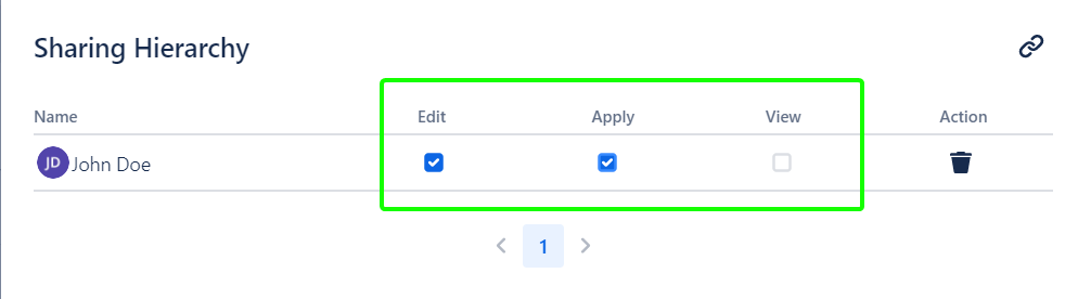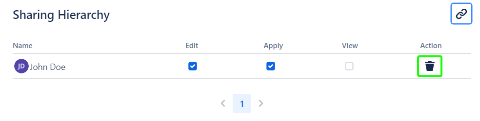 To decline shared Permissions, click the ‘Share’ button in the Hierarchy row and click the ‘Bin’ icon in the user row: