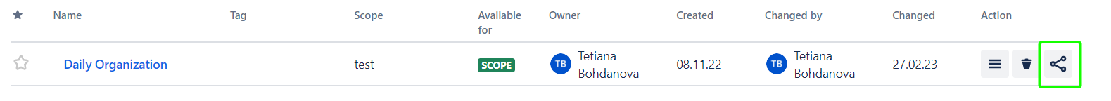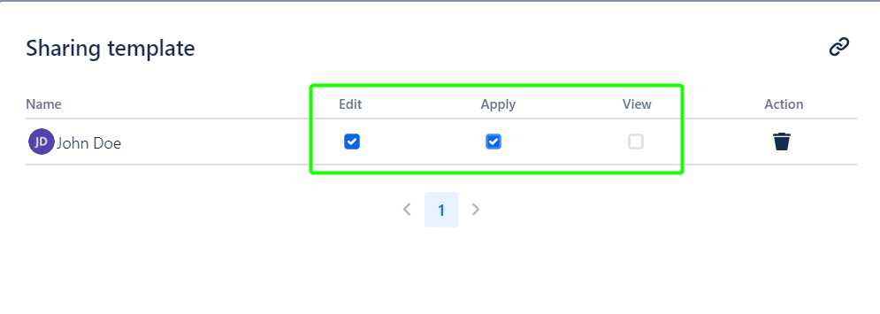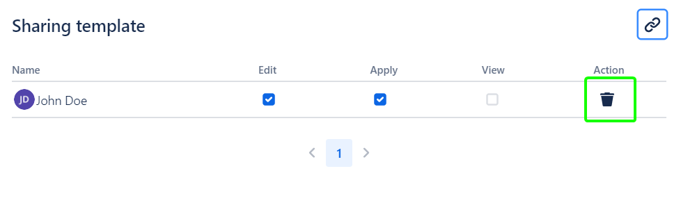To decline shared Permissions, click the ‘Share’ button in the Template row and click the ‘Bin’ icon in the user row: