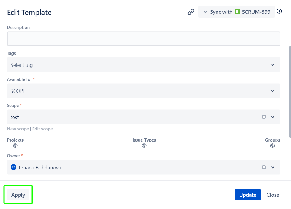 The ‘Apply’ button will directly appear in the ‘Edit Template’ dialog to give the user a shared Apply Template Permission to apply the current Template.