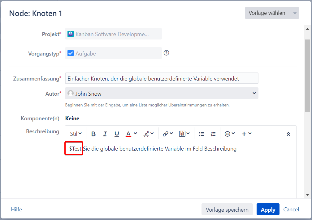 Jetzt wenn Sie benutzerdefinierte Variablen haben, können Sie si im Textfeld des Hierarchieknotens benutzen.