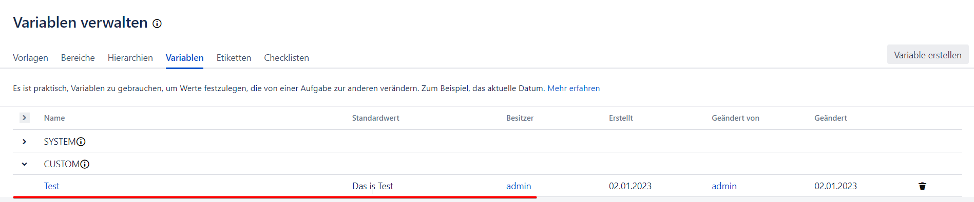 Mit benutzerdefinierten Variablen können Sie eine Variable erstellen, die in jeder Hierarchie benutzt werden kann.