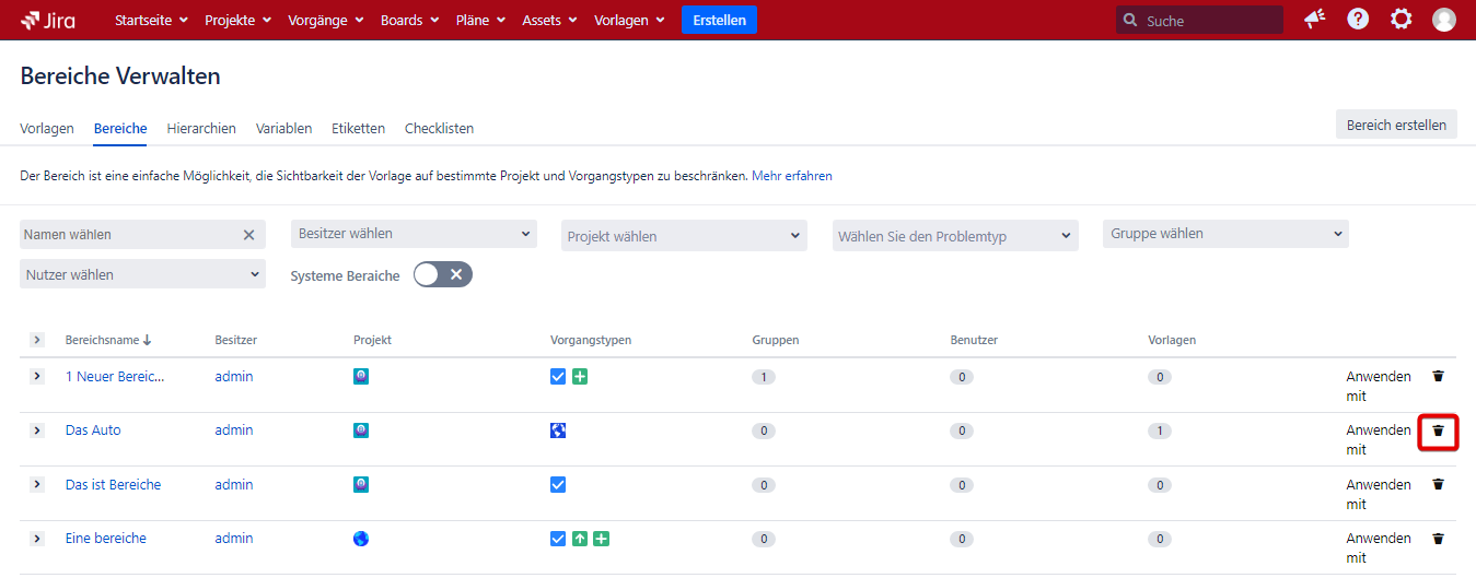 Ein Bereich kann nur vom Besitzer oder Administrator des Bereichs gelöscht werden, wenn dem Bereich keine Vorlagen zugeordnet sind.