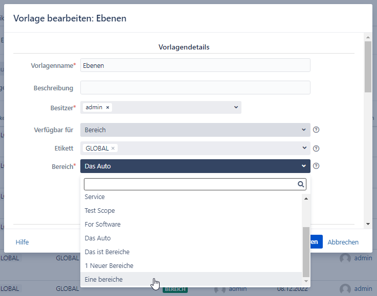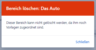 Der Bereich "Entwicklung" kann nicht gelöscht werden. Wenn Sie versuchen, einen Bereich zu löschen, dem mindestens eine Vorlage zugeordnet ist, sehen Sie hier so eine Ausgabe: