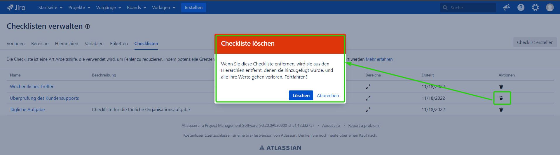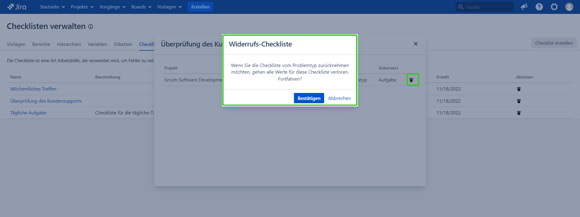 Um die Checkliste zu löschen, müssen Sie auf der Seite ‘Checklisten verwalten’ auf das Papierkorbsymbol klicken und Ihre Entscheidung mit der Schaltfläche ‘Löschen’ im Dialogfeld ‘Checkliste löschen’ bestätigen.