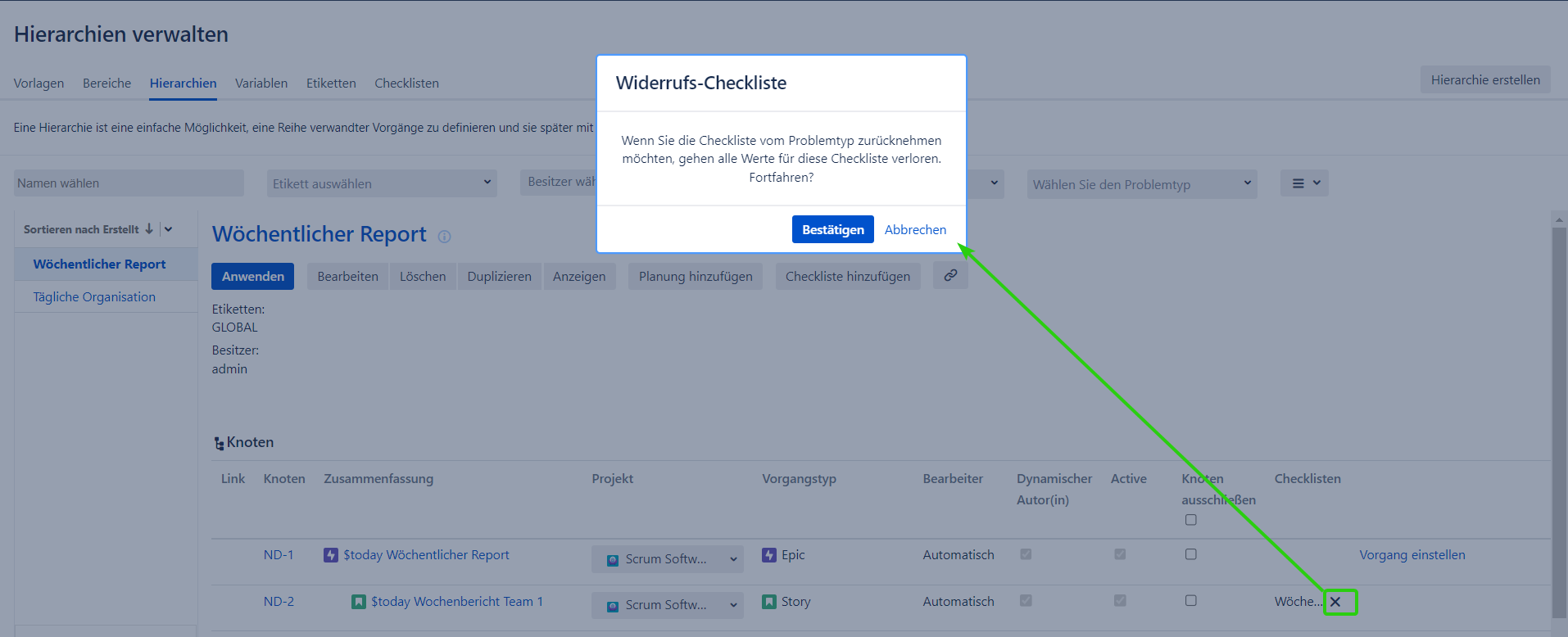 Wenn Sie die Checkliste entfernen, wird sie aus den Hierarchien entfernt, denen sie hinzugefügt wurde, und alle ihre Werte gehen verloren.