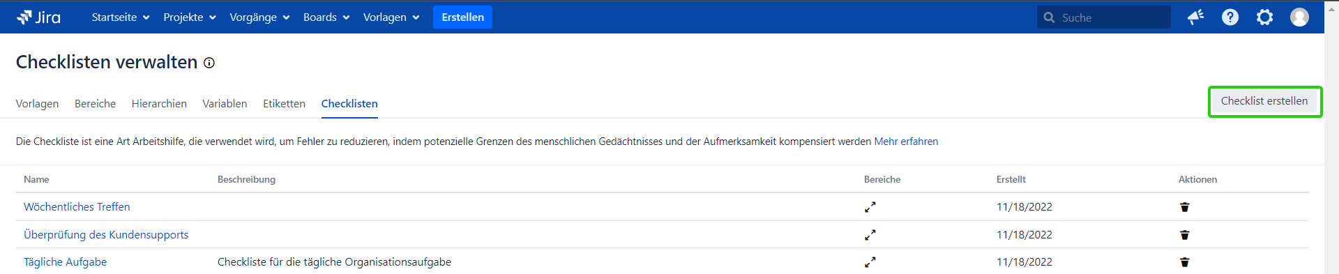 Die Mitglieder der jira-administrators-Gruppe können alle Checklisten auf der Seite ‘Checklisten verwalten’ anzeigen, wenn ihnen die Berechtigung ‘Checklisten verwalten’ auf der Seite ‘Globale Berechtigungen’ erteilt wurde.