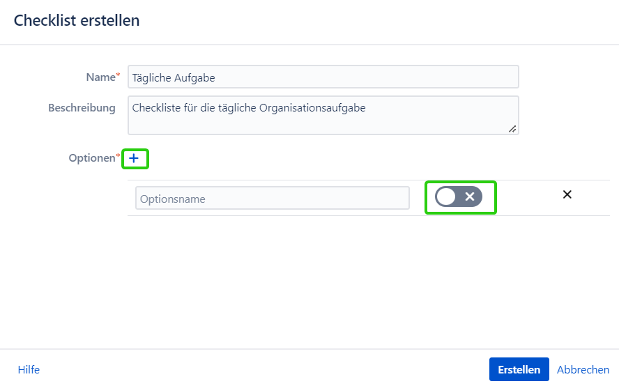 Geben Sie den Namen der Checkliste in das erforderliche Feld ‘Name’ und ihre Beschreibung in das optionale Feld ‘Beschreibung' ein.