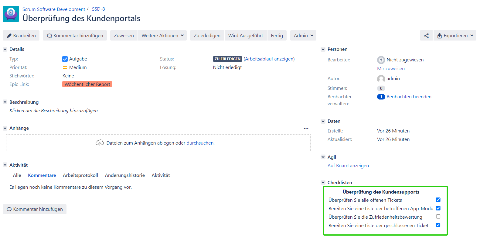 Die Anzeige der Checklisten auf der Problemansichtsseite richtet sich nach dem Wert, der im Feld ‘Verfügbar für’ des Dialogs ‘Checkliste erstellen’ eingestellt ist