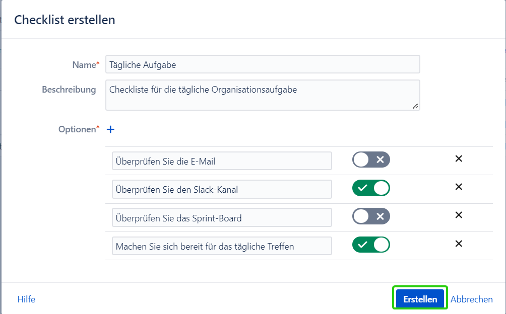 Klicken Sie auf die Schaltfläche ‘Erstellen’ in der Fußzeile des Dialogfelds ‘Checklist erstellen’ .