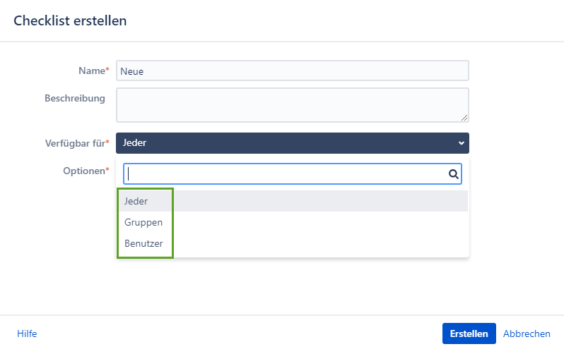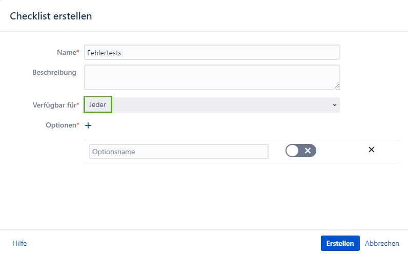 Feldwert ‘Verfügbar für’ im Dialogfeld ‘Checkliste erstellen’.