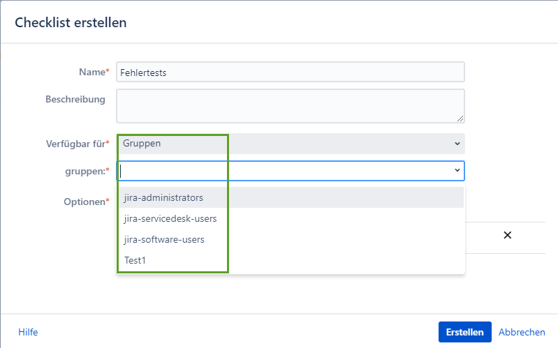 Wählen Sie den Wert ‘Gruppen’, wenn Sie den Zugriff auf die aktuelle Checkliste für die bestimmte Gruppe/Benutzergruppen beschränken möchten, und geben Sie diese Gruppe im obligatorischen Feld 'Gruppen' an.