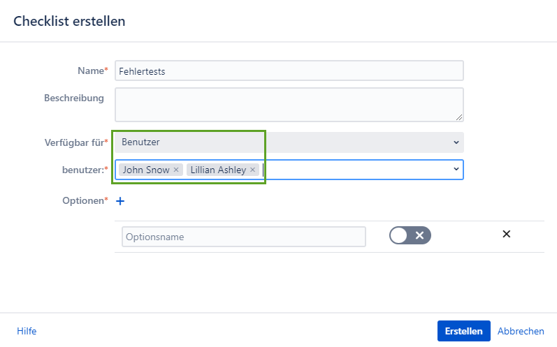 Wählen Sie den Wert 'Benutzer', falls Sie möchten, dass bestimmte Benutzer Zugriff auf die aktuelle Checkliste haben. Beginnen Sie mit der Eingabe des Benutzernamens, um die Liste der Benutzernamen anzuzeigen, die die folgende Zeichenkombination enthalten.