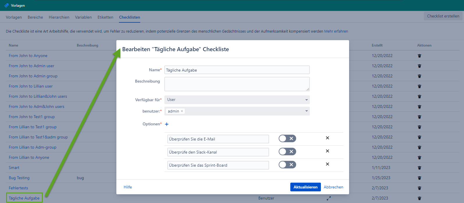 Nehmen Sie die erforderlichen Änderungen vor und klicken Sie auf die Schaltfläche ‘Aktualisieren’ in der Fußzeile des Dialogfelds ‘Bearbeiten Checkliste’.