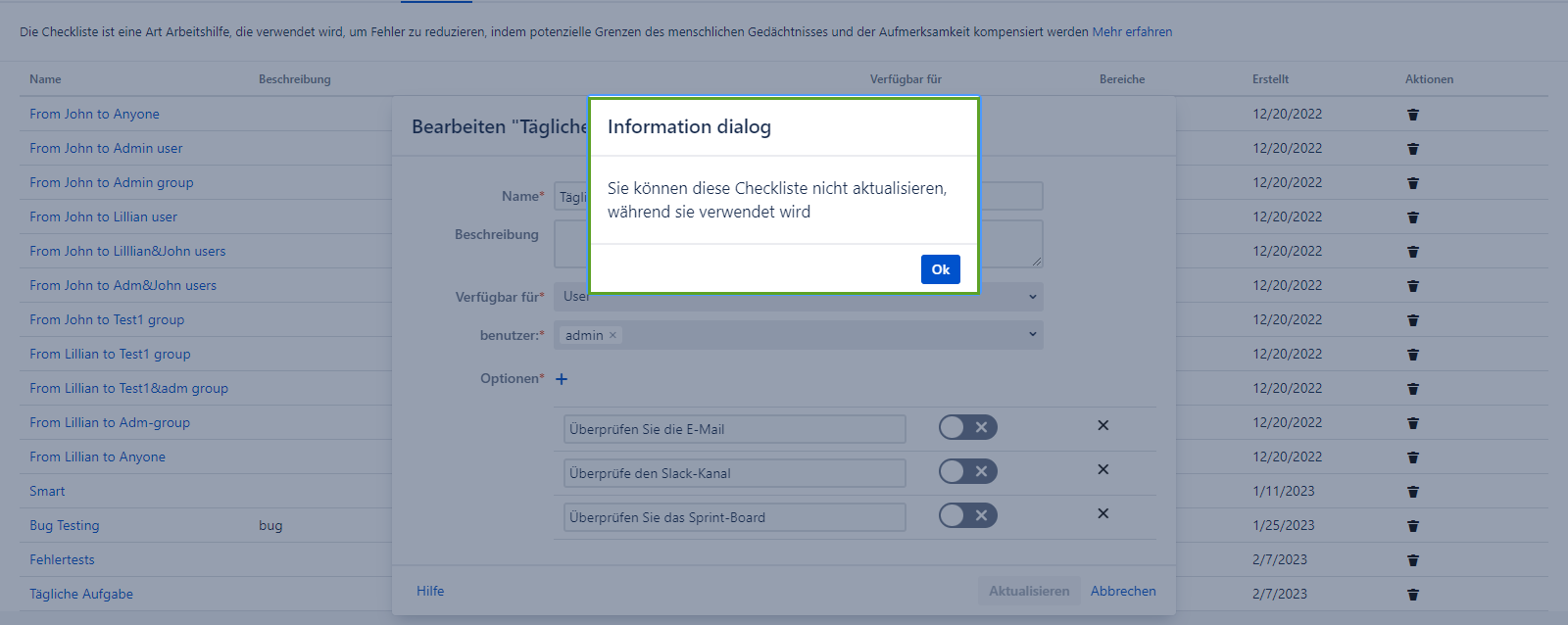 Nachdem Sie auf den Namen der Checkliste geklickt haben, erhalten Sie diese Art von Benachrichtigung.