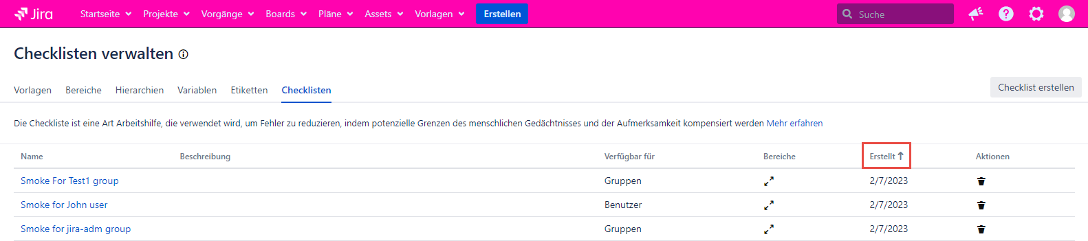 Klicken Sie erneut auf den Spaltennamen „Erstellt“ und die Checklisten werden von früher nach älter erstellt sortiert.