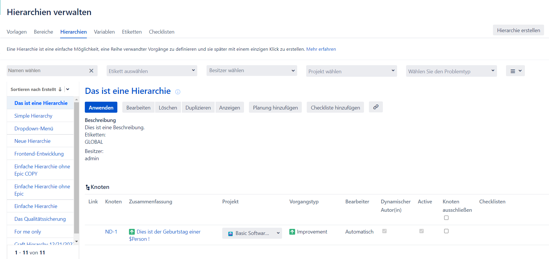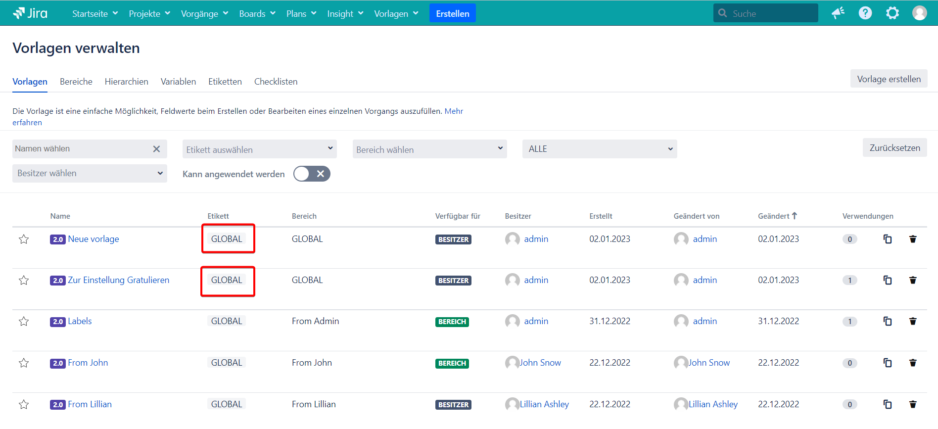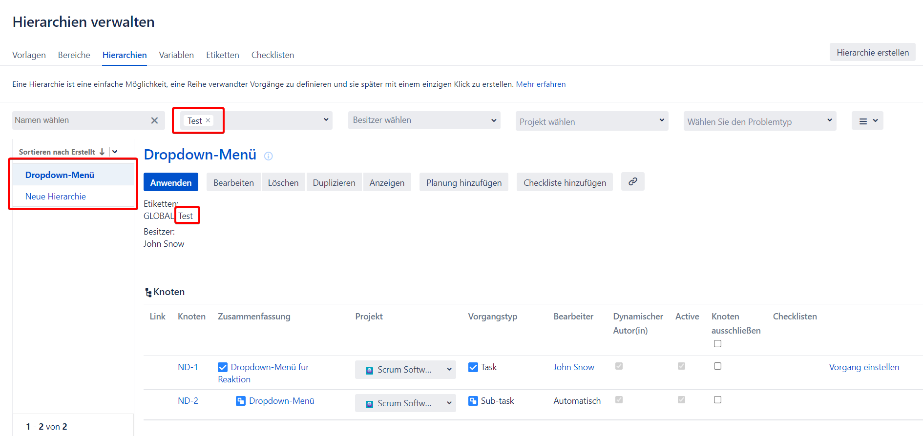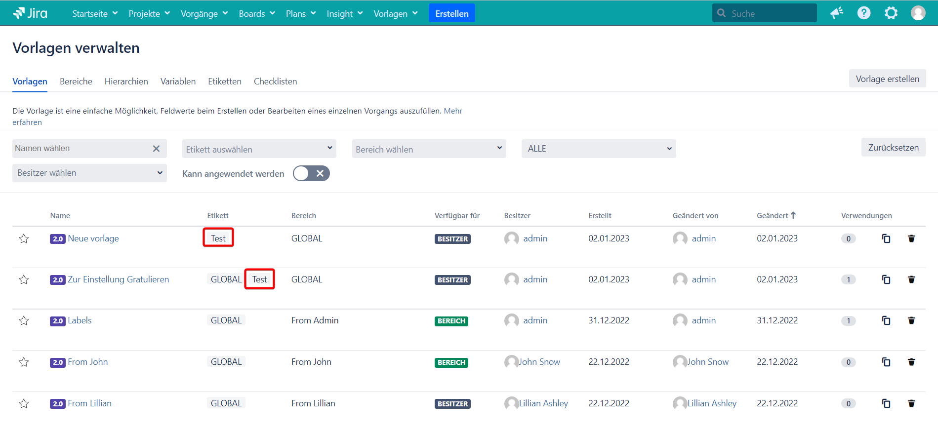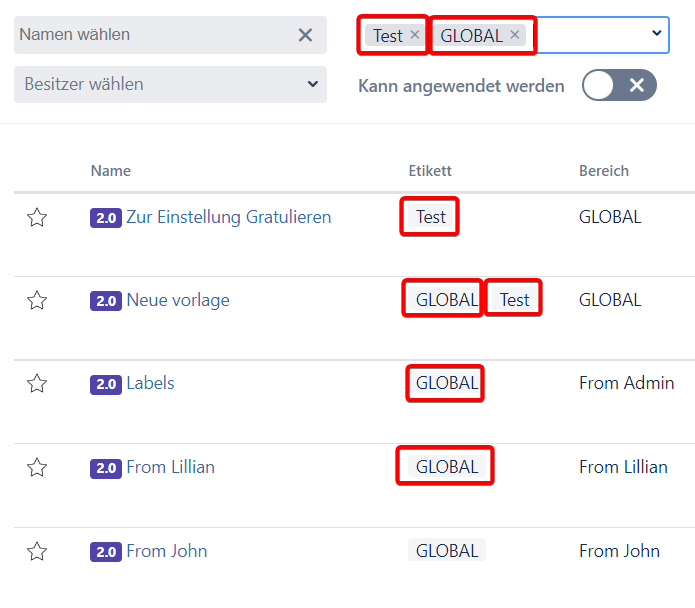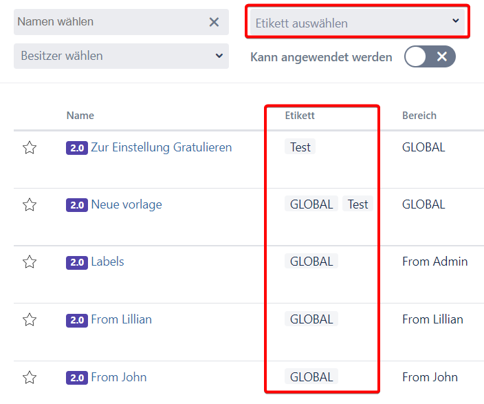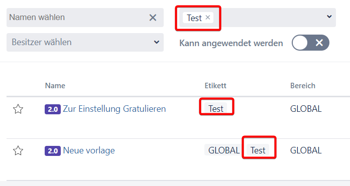 6.Wie können die Vorlagen und Hierarchien mithilfe von Etiketten filtriert werden?