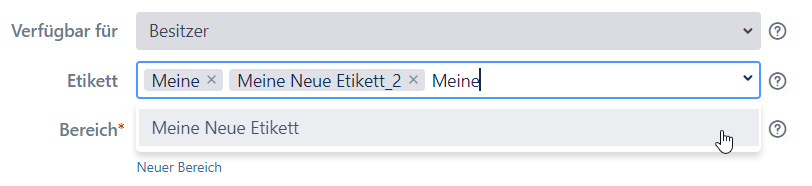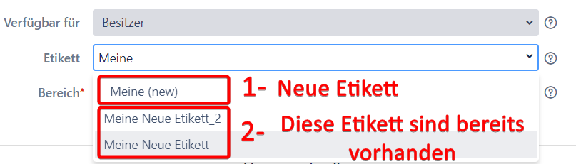 Sie müssen mindestens drei Zeichen eingeben und der Plugin bietet Ihnen alle Etiketten an, die solchen Satz der Zeichen in ihren Namen enthalten. Sie können das Etikett mit der Markierung "(Neue)" auswählen. Nach der Erstellung der Vorlage erscheint das neue Etikett im System. Sie können auch ein existierendes Etikett aus der Liste auswählen.