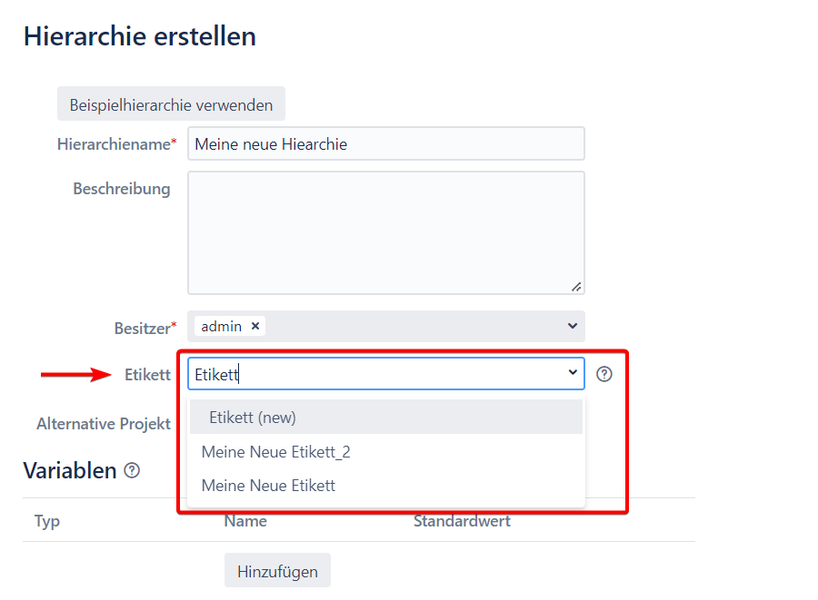 Um ein Tag zur Hierarchie zuzuordnen , zuerst müssen wir zur Seite “Hierarchie Erstellen“ gehen. Dort geben Sie die gewünschten Etiketten zum entsprechenden Fefd ein. Sie können die Dokumentation über Erstellung der Hierarchien hier finden.