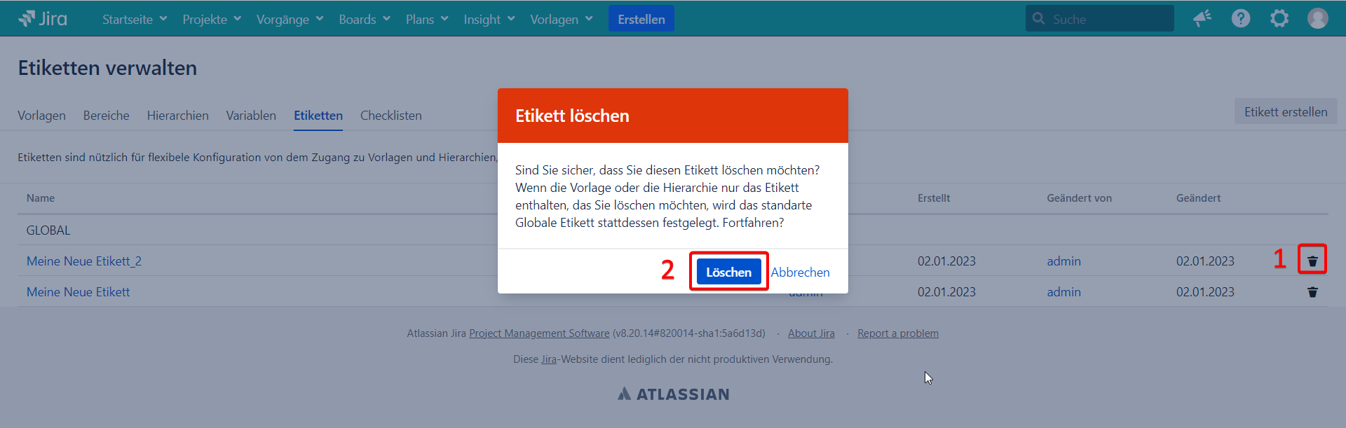 Sie empfangen eine Warnung, dass wenn das Etikett in einer Vorlage oder Hierarchie benutzt wird, wird er daraus entfernt. Wenn die Vorlage oder Hierarchie nur das Etikett enthält, den Sie löschen möchten, wird das Globale Etikett stattdessen eingestellt.