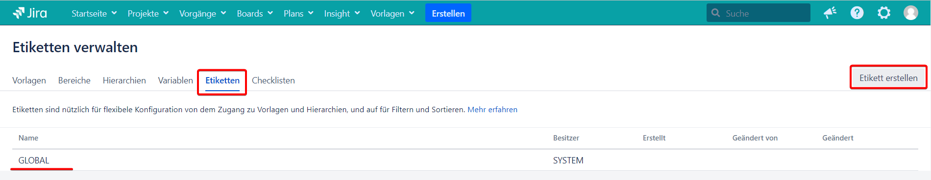 Alle Etiketten sind auf dieser Seite angezeigt. Es gibt bereits GLOBALES Etikett auf dieser Seite. Standartmäßig ist dieses Etikett allen neuen Vorlagen und Hierarchien zugeordnet.