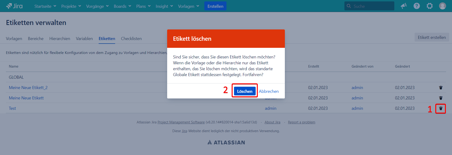 Um ein Etikett aus dem System zu löschen, klicken Sie auf Papierkorb-Symbol.