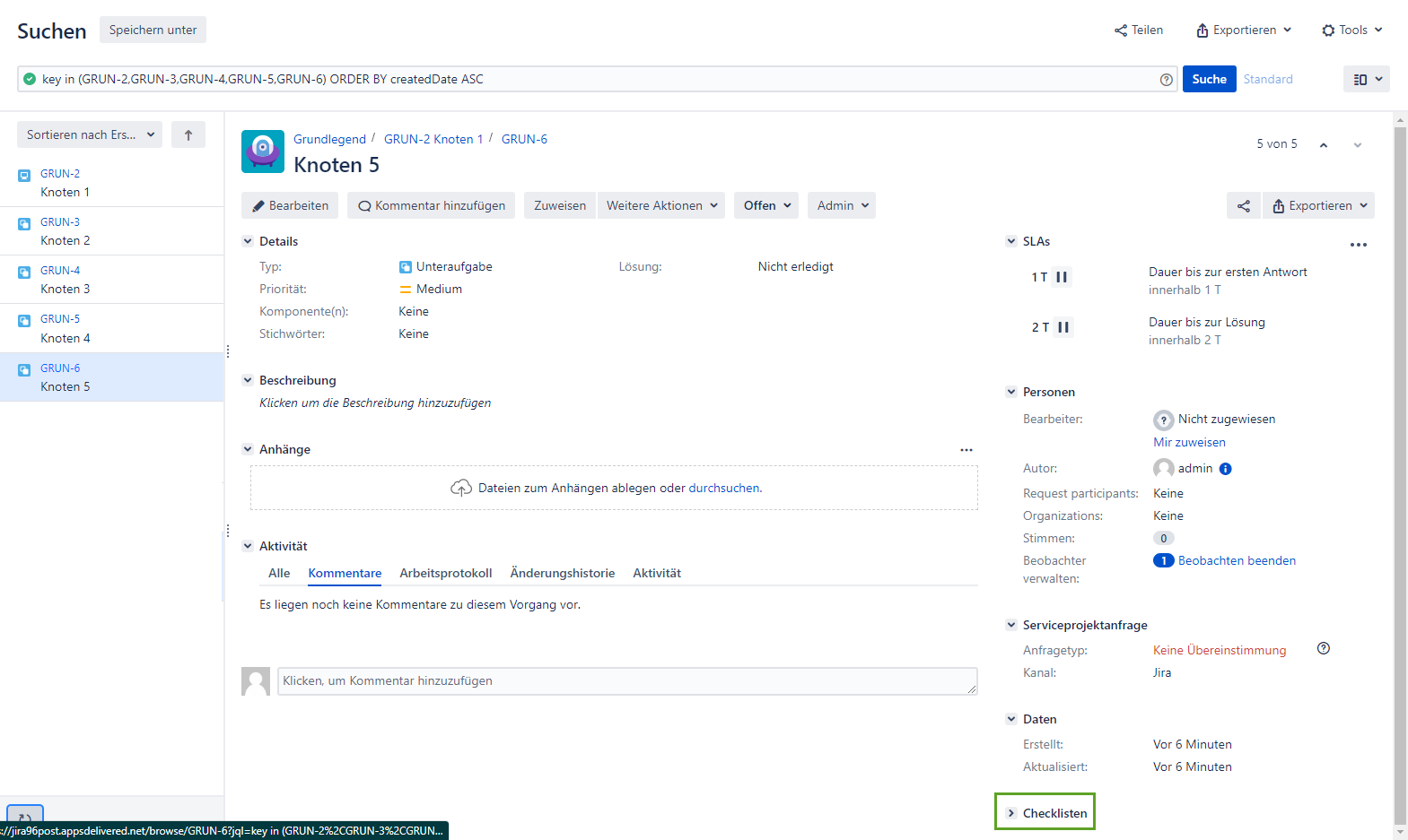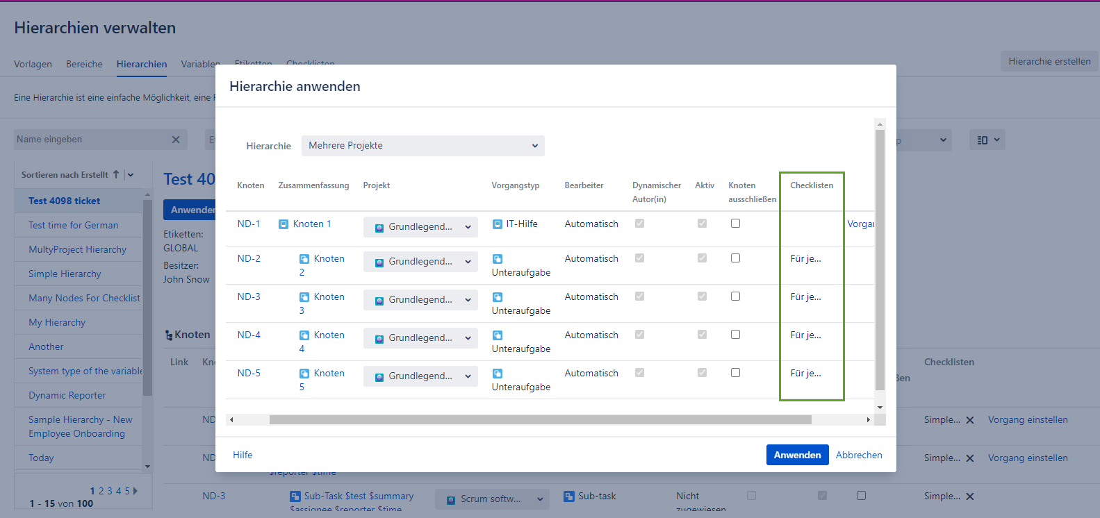 Die Checklisten, die für den aktuellen Benutzer durch den Feldwert Verfügbar für im Dialogfeld Checkliste erstellen verfügbar sind, werden auf der Seite Problemansicht angezeigt, nachdem die Hierarchie angewendet wurde.