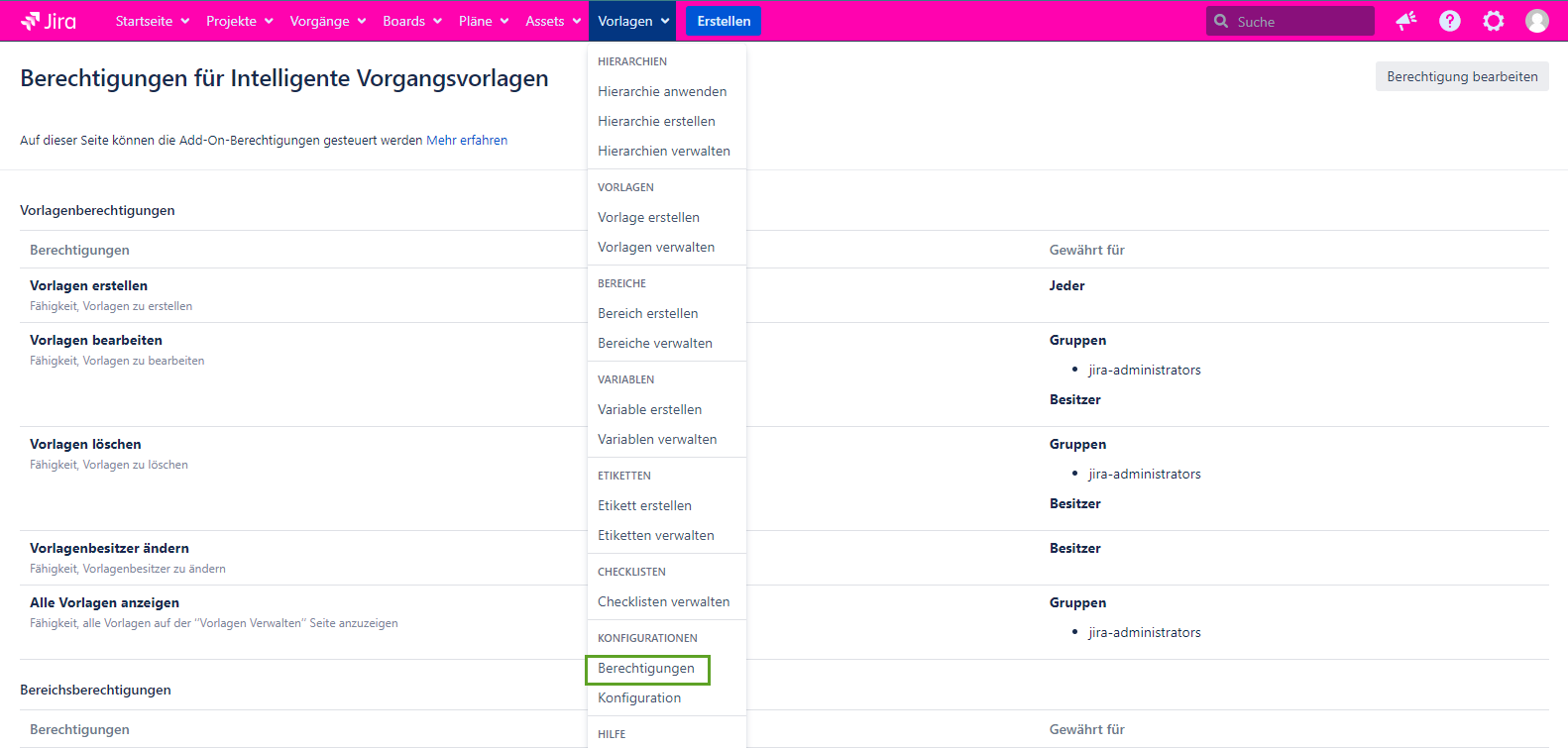Der Benutzer mit dieser Berechtigung sieht alle Vorlagen in Jira.