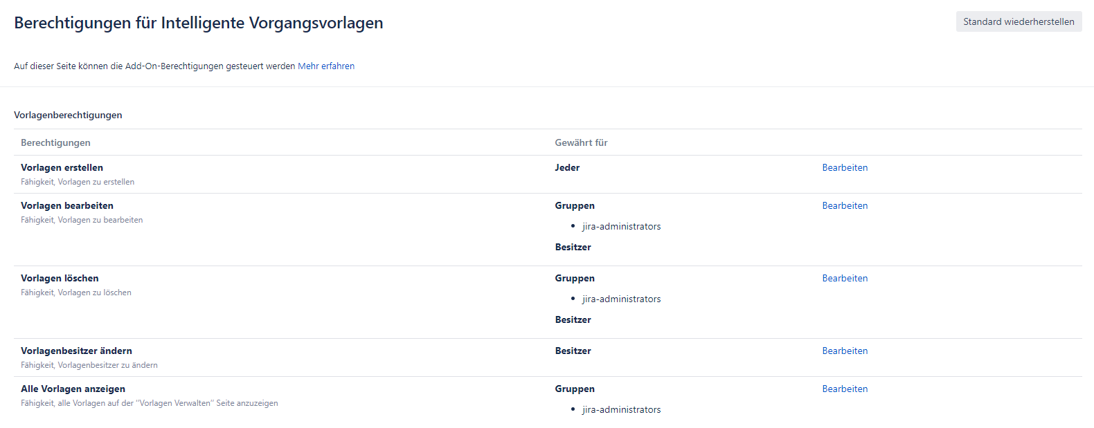 Der Benutzer mit dieser Berechtigung kann Vorlagen bearbeiten, die für ihn in Jira verfügbar sind, außer dem Fall, wenn die Berechtigungsoption auf Besitzer festgelegt ist, wodurch nur vom Benutzer erstellte Vorlagen bearbeitet werden können.