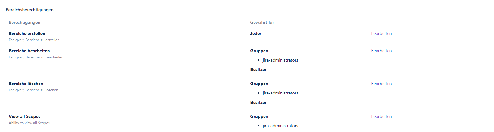 Um Berechtigungen für Bereiche festzulegen, wählen Sie die erforderliche Berechtigung in einer Tabelle mit Bereichsberechtigungen aus und klicken Sie auf Bearbeiten.