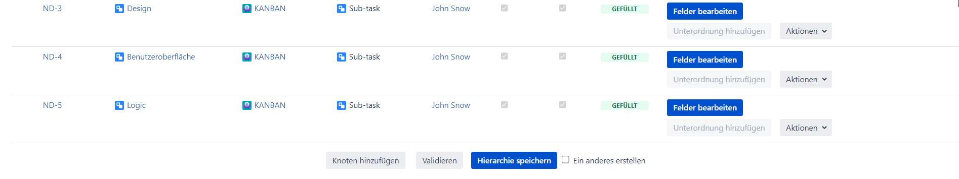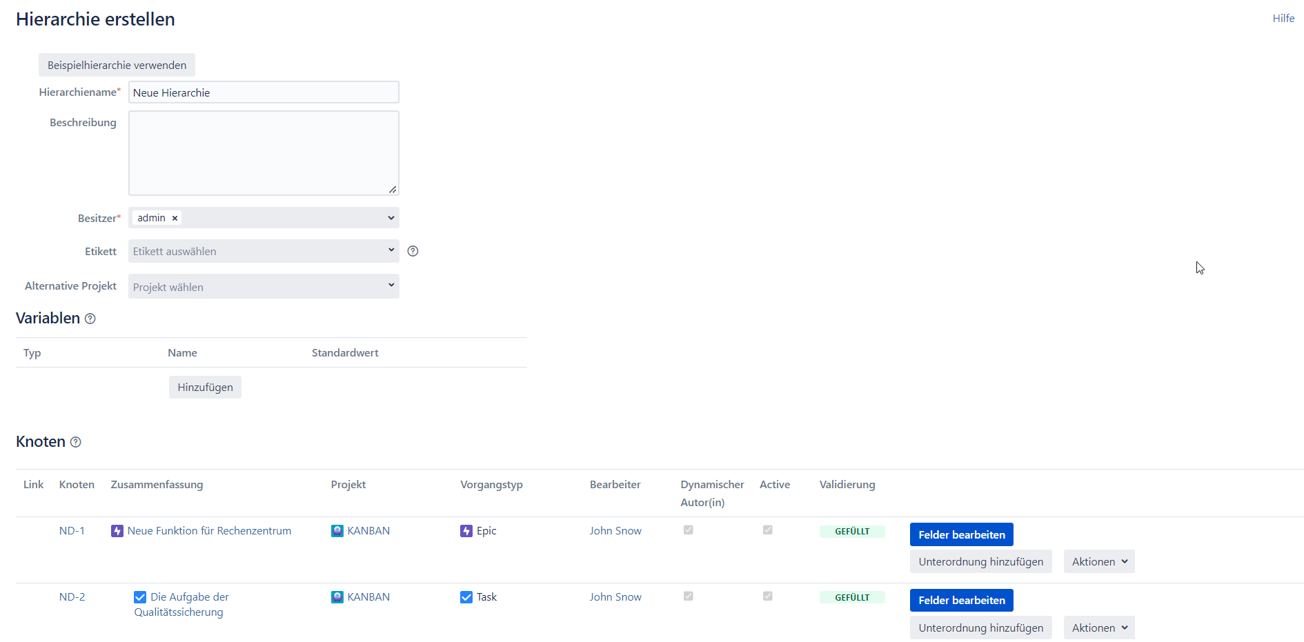 9. Erstellen Sie Knoten für alle Vorgänge, die Sie im Zusammenhang mit dieser Hierarchie brauchen. Sie können verschiedene Projekte und Vorgangtypen in einer einzigen Hierarchie mischen.